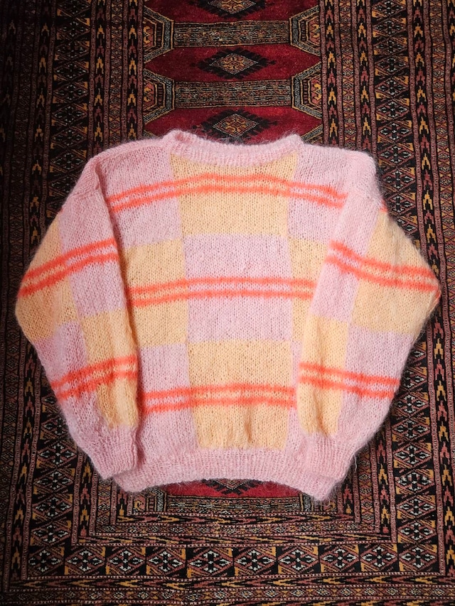 推定80年代~ UK Vintage "Punk" Mohair Knit ヴィヴィアン的パンクデザイン! ~~~~~~~~~~~~ [商品説明] ヨーロッパヴィンテージのモヘアニット、 "セッズ"的な雰囲気を感じるカラーリングも魅力的。 ハンドメイドらしいざっくりした編み目に、 この年代らしいドロップショルダー×ドルマリンスリーブが◎ モヘア混毛率70%超えのお化け毛足は、 US物とは全く別物と言えるヨーロッパらしい1着です。 羽織りやすい程よい厚みでインナーとしても◎ ~~~~~~~~~~~ [Item Background] 70-80年代当時、 イギリスでは一般的だったモヘアニットは、 "ヴィヴィアン・ウエストウッド"らにより、 そのまま流用され、 パンク~ニューウェイブのシーンにかけて、 アイコン的アイテムの一つに… "Sex Pistols"のメンバーも頻繁に着用しており、 特に"ジョニー・ロットン"は印象的です。 今回入荷のアイテムは、 "初期パンク"感のある大振りなブロックチェック×ライン入りのデザイン いかにもなパンク色のあるカラーリングが当時のヴィヴィアン界隈を彷彿とさせる1着です。 どことなく"セッズ"味を感じる1着。 前衛的に仕上がった雰囲気が最高です。 現在でもヴィヴィアン・ウエストウッドをはじめ、 数々のパンクブランドが作成し続けるモヘアニット、 ヴィンテージは大変希少です。 デザインやサイズにその雰囲気まで… リアルな当時物の雰囲気をぜひ。 ~~~~~~~~~~ [実寸] 肩幅:65cm 身幅:57cm 着丈:62cm 袖丈:50cm 肩はドロップショルダーです。 多少の誤差はご了承下さい。 [着用者] 179cm 58kg 丁度良い着やすいサイズです。 [状態] よく見ると白い部分にピンクの薄い色移りがありますがほぼほぼ目立ちません。 モヘア独特の使用感はありますが、 着用に支障のあるダメージはありません。 ※ヴィンテージ古着ですので、 神経質な方はご遠慮下さい。