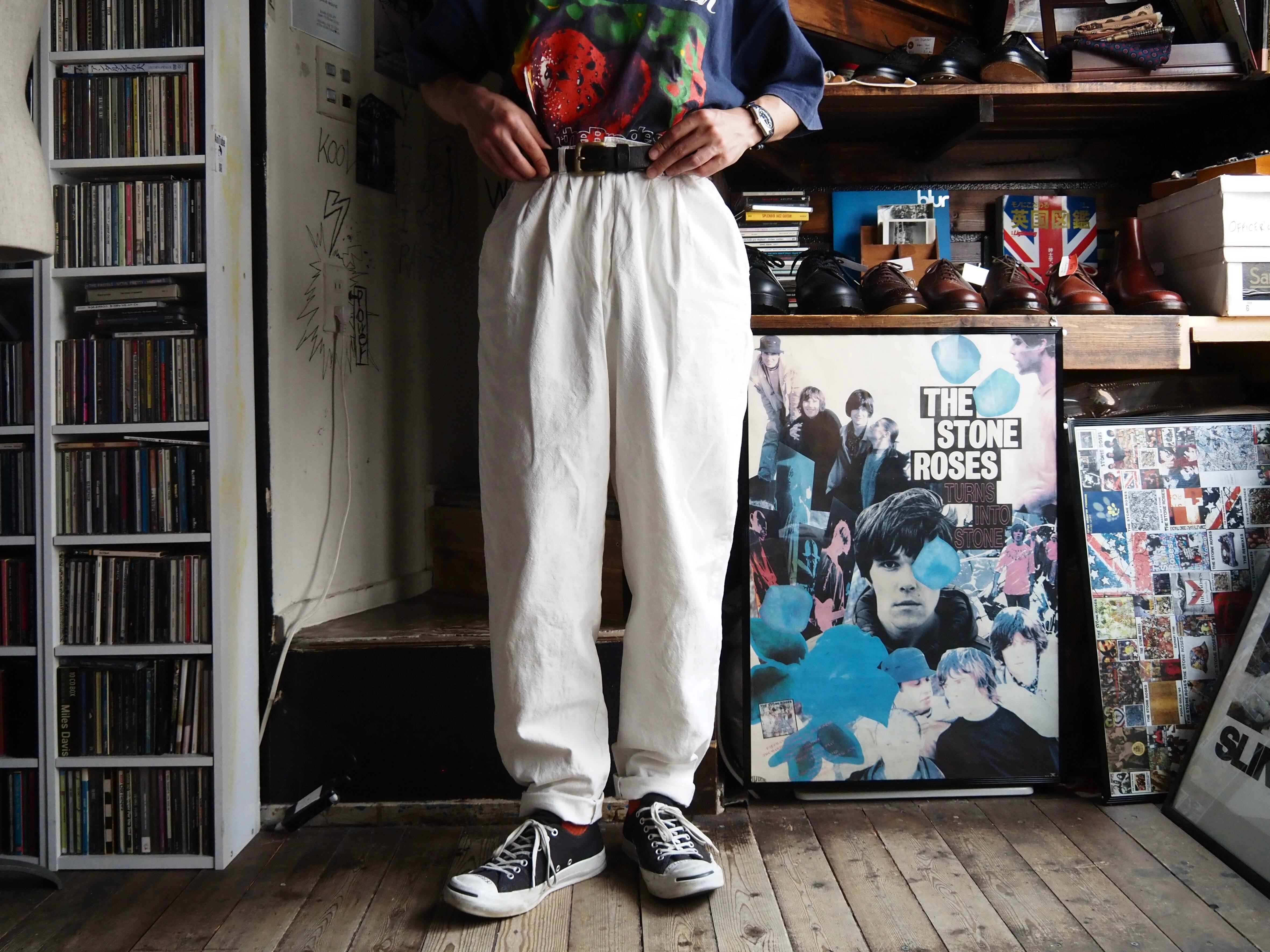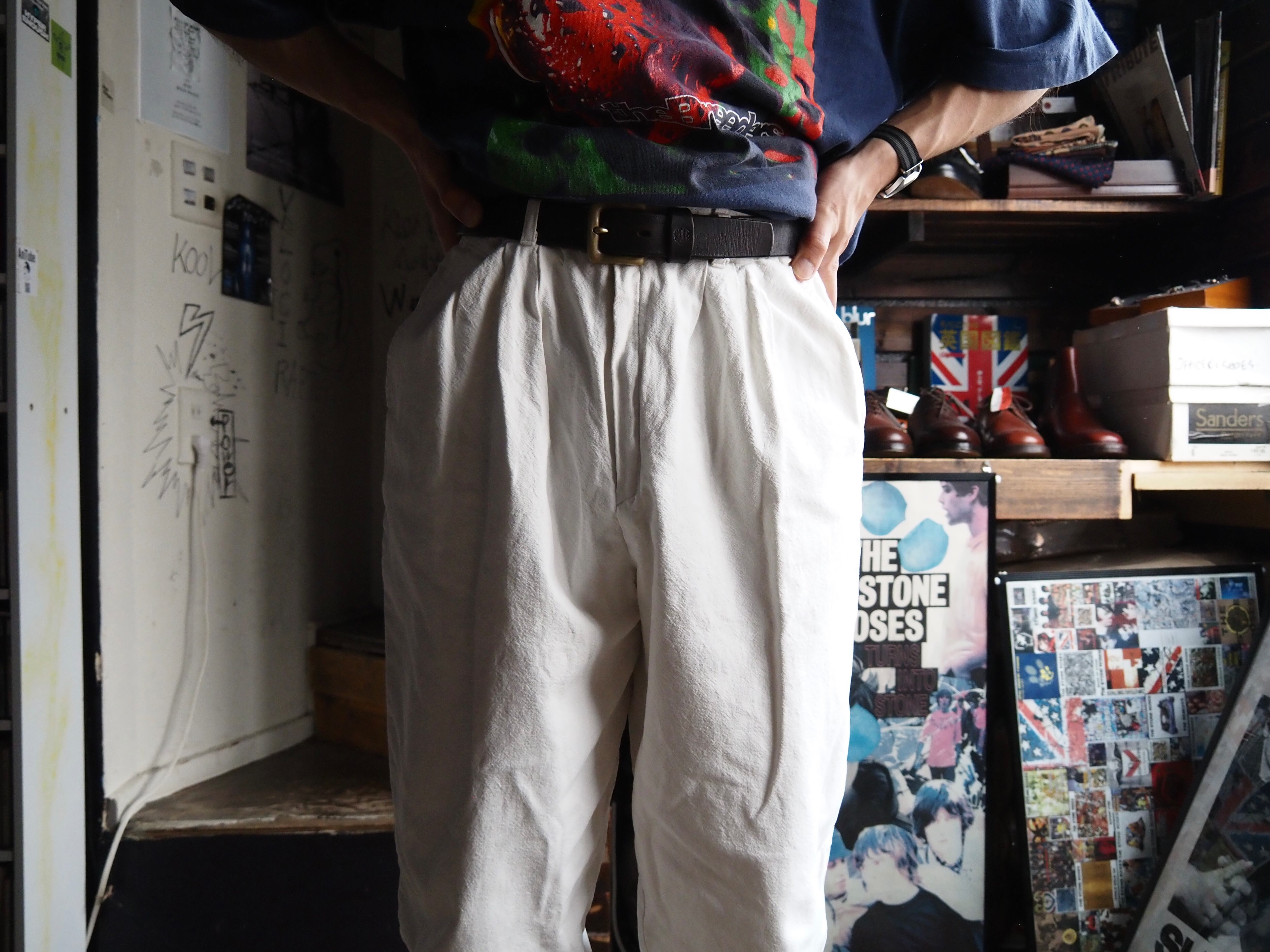 しっかり高めで履いて生真面目なナードスタイル、腰履き気味で裾に生地を溜めた気怠いルーズなスタイル、どちらもおすすめ。