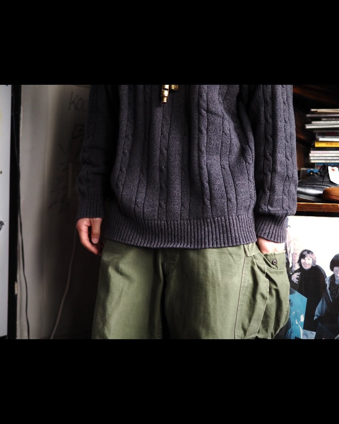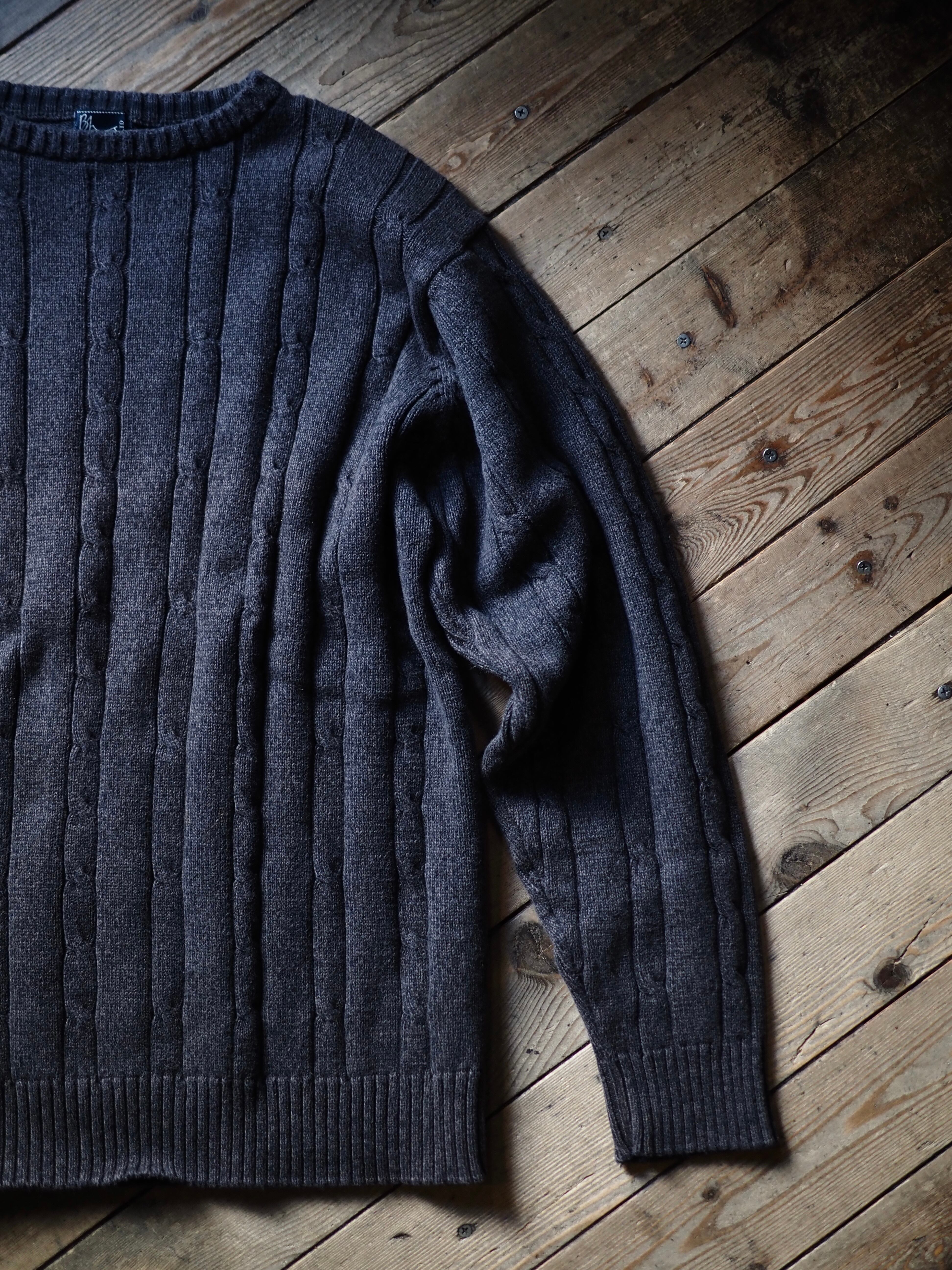 落ち着いたチャコールグレーカラーに程よいピッチのケーブル編み。とてもイギリスらしい”地味でトラディショナル”なデザインです。