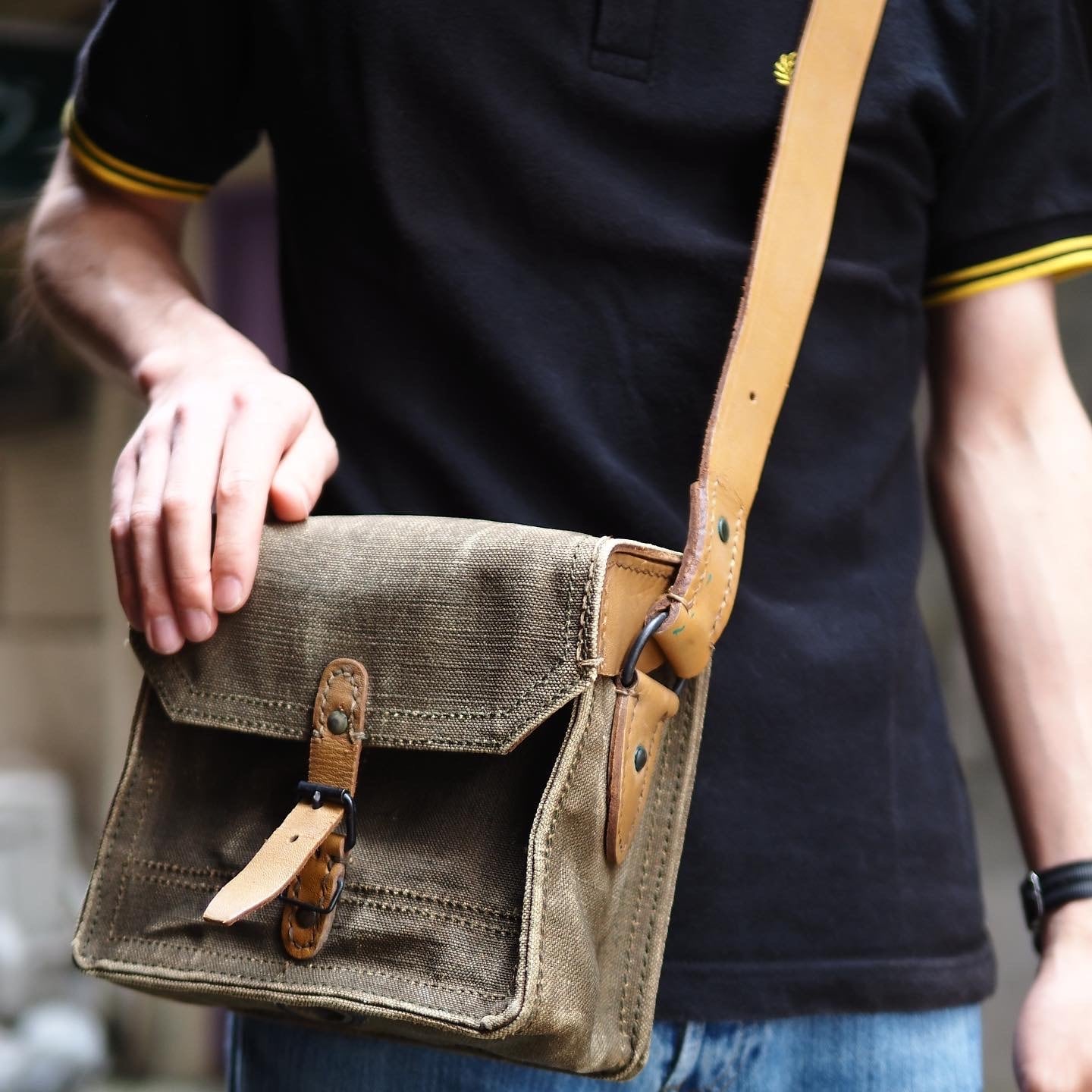 ハリのある厚地のキャンバス地と肉厚なレザーを贅沢に合わせた、ビンテージ感漂うショルダーバッグ。