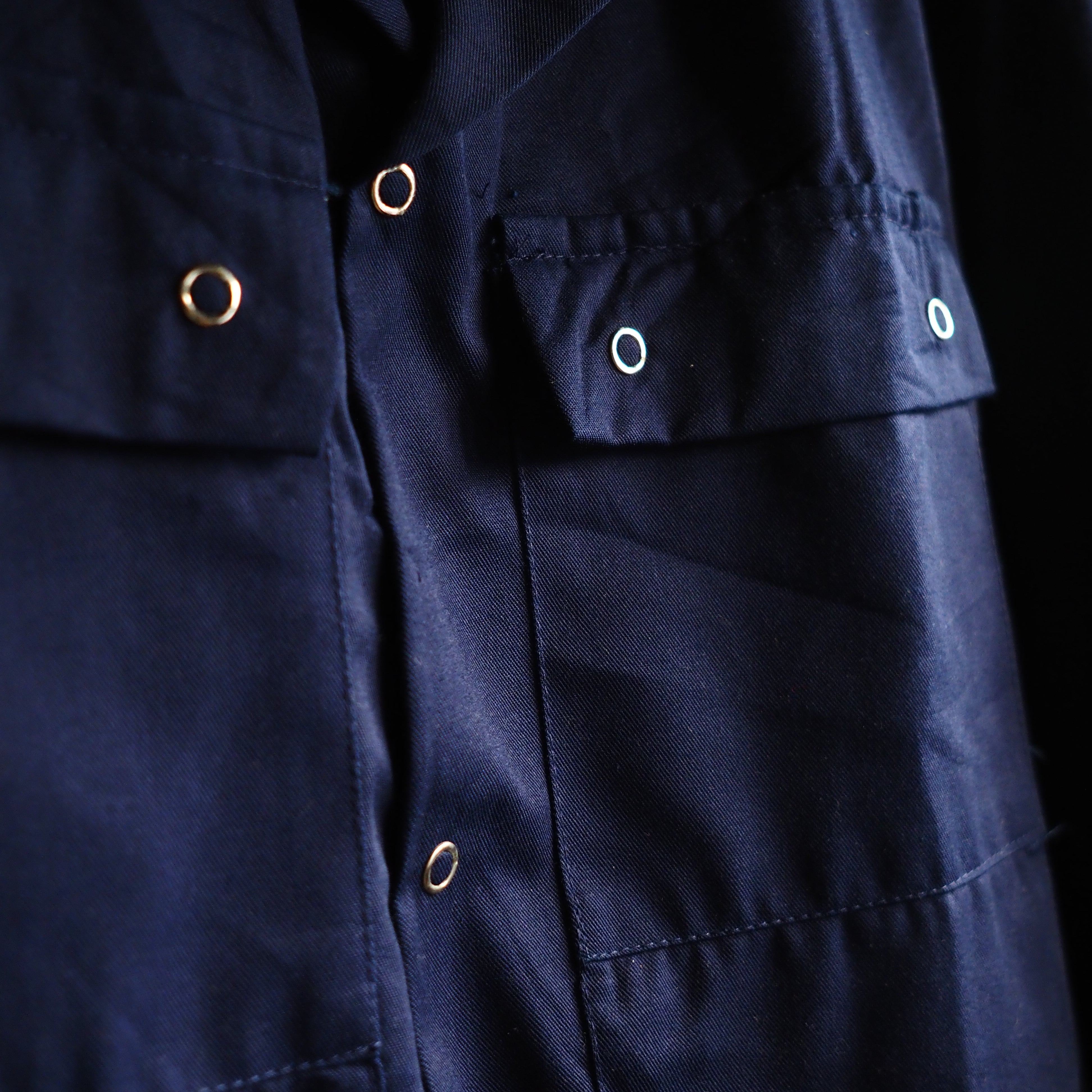 コットンとポリエステルのミックス生地で、鈍い艶感のあるソリッドなダークネイビーカラー。