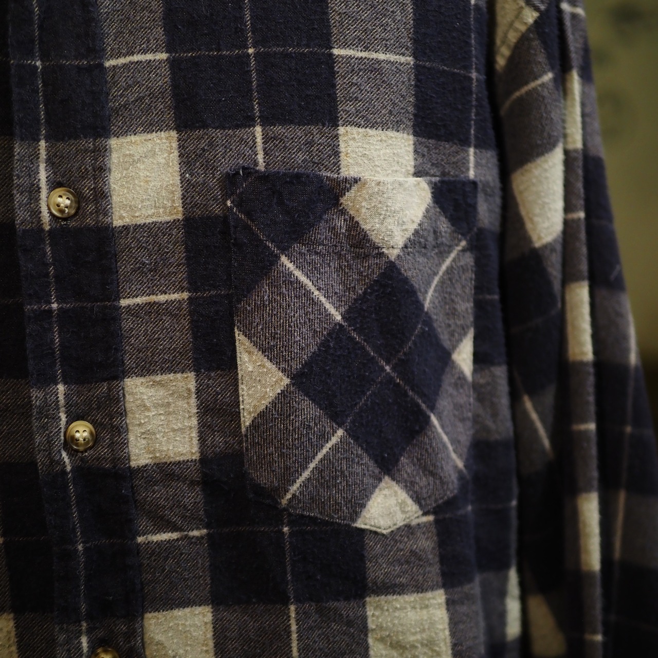 ふわっと柔らかな質感のプリントフランネル生地。表面の毛羽立ちは古着のネルシャツらしい良い雰囲気。