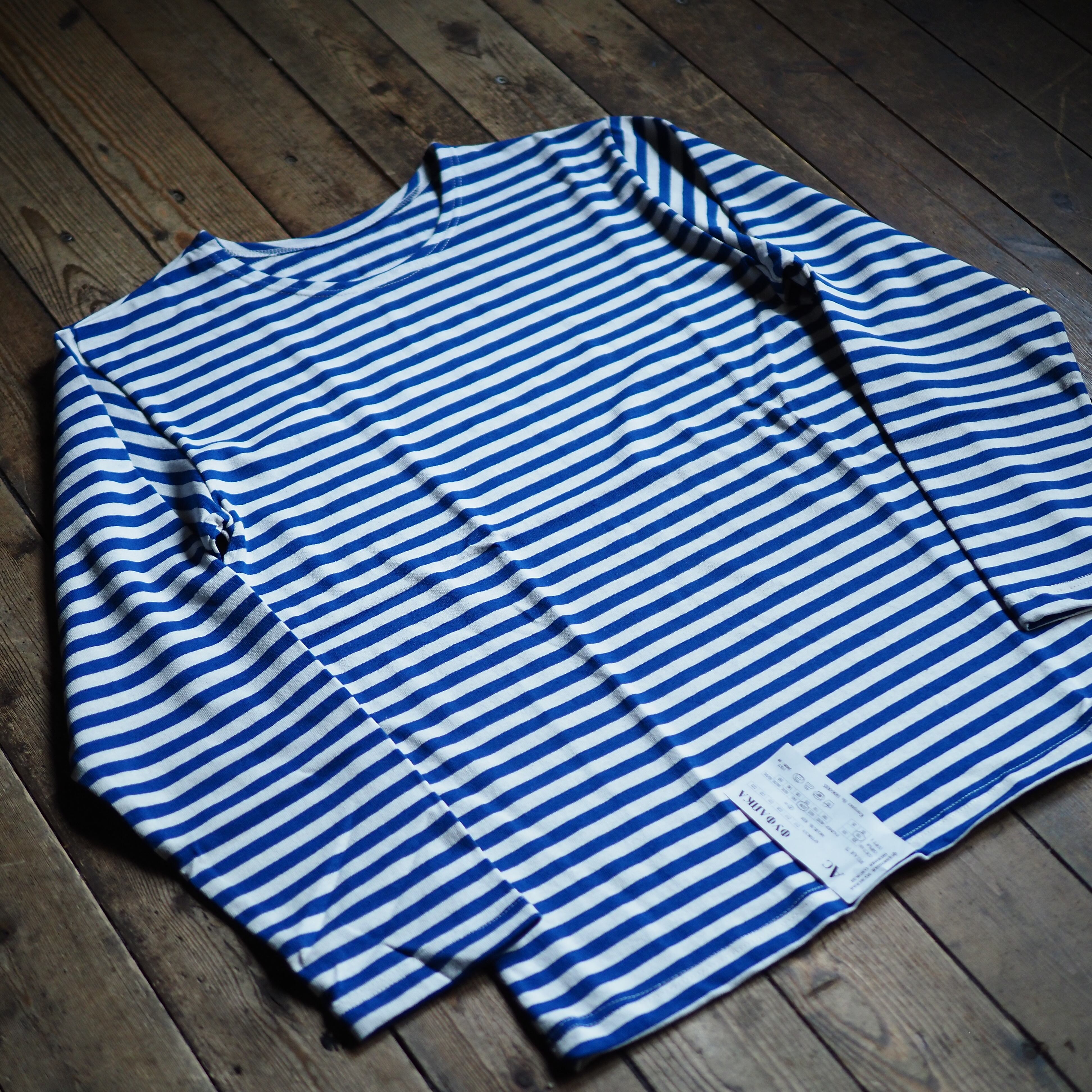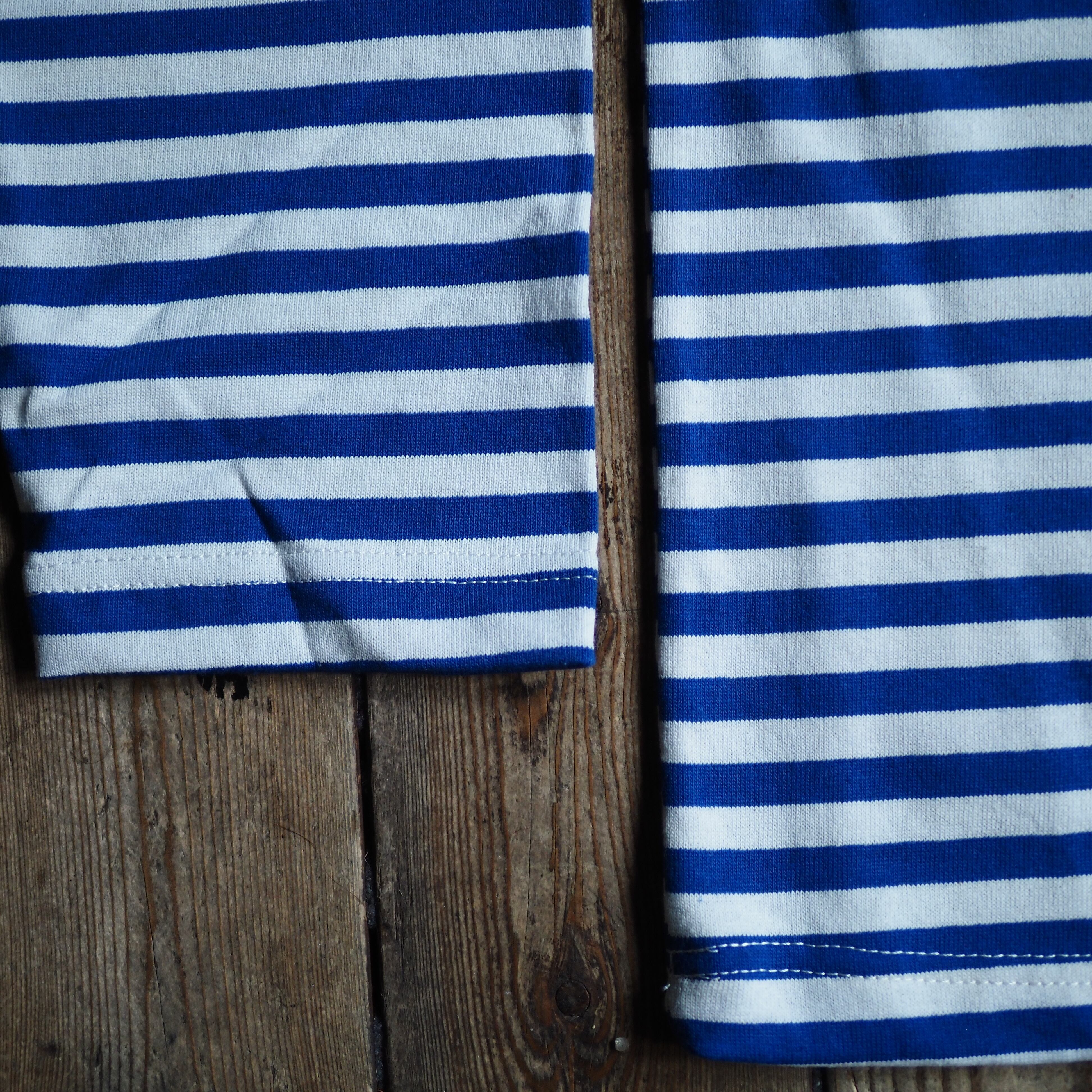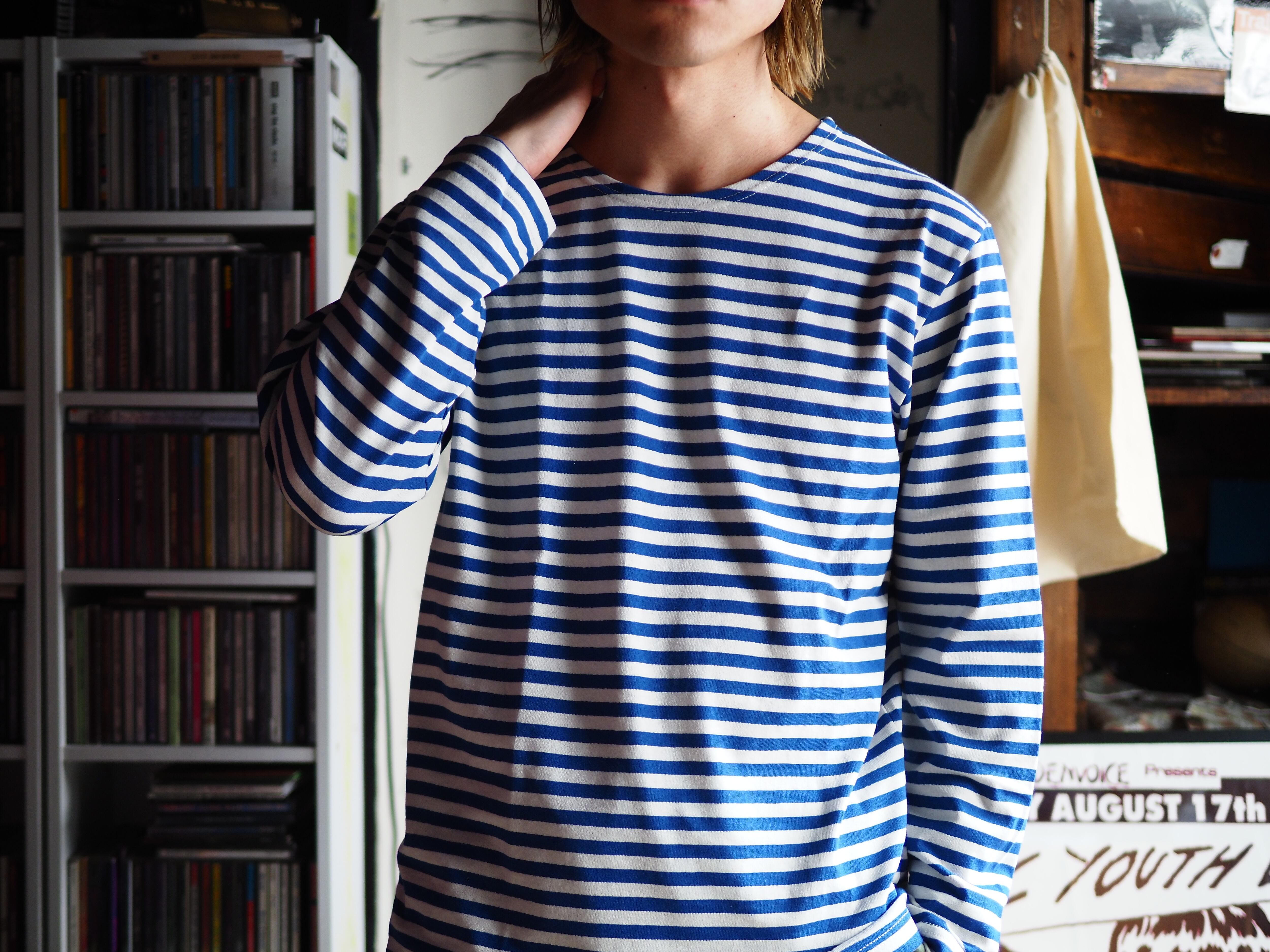 フレンチのボートネックのバスクシャツは似たキャラクターのアイテムですが、こちらはオーセンティックなクルーネック仕様。首が広く開くボートネックが苦手、という方にもこちらをおすすめします。