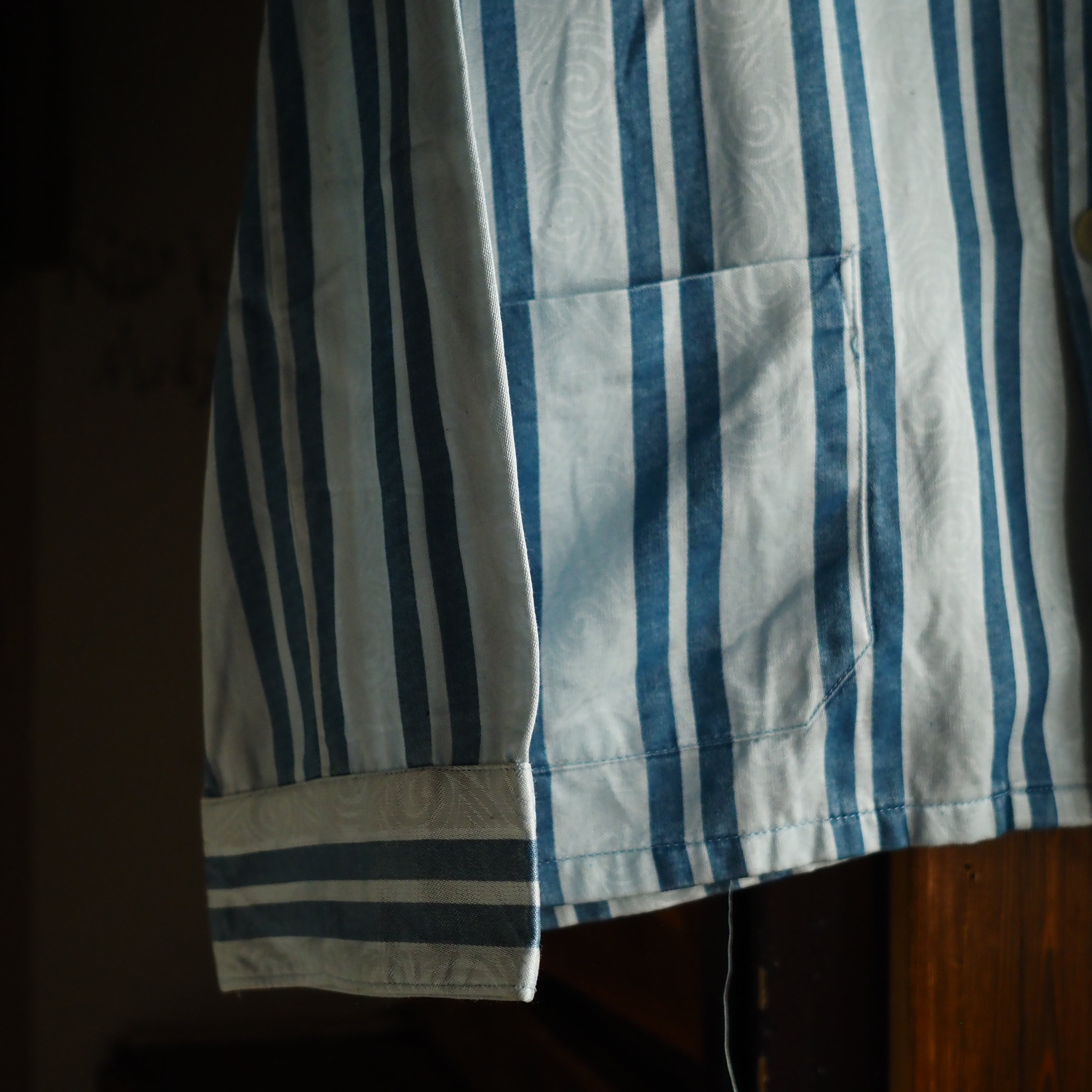 グランジを連想させる青ストライプ。このパジャマの面白いところはストライプの間に薄く潜む謎のグルグル模様です。