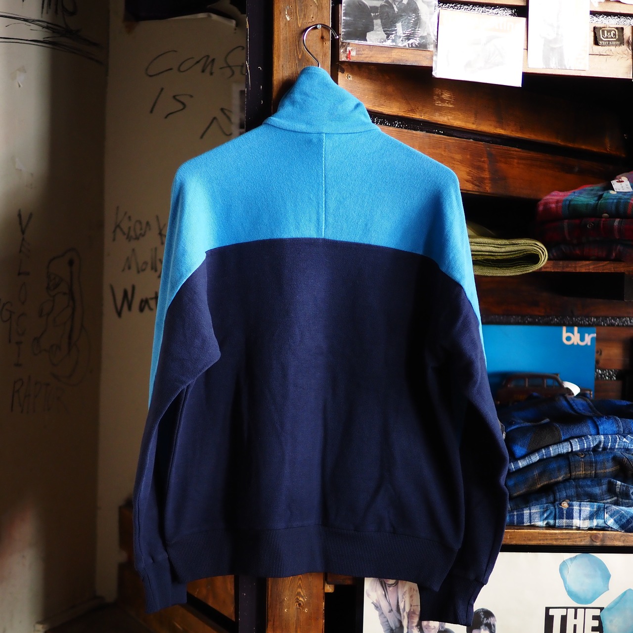 サックスブルー、ネイビー、ホワイトの定番カラーリング。シンプルなカラーリングですが、発色が古めかしく、ビンテージジャージらしい雰囲気です。