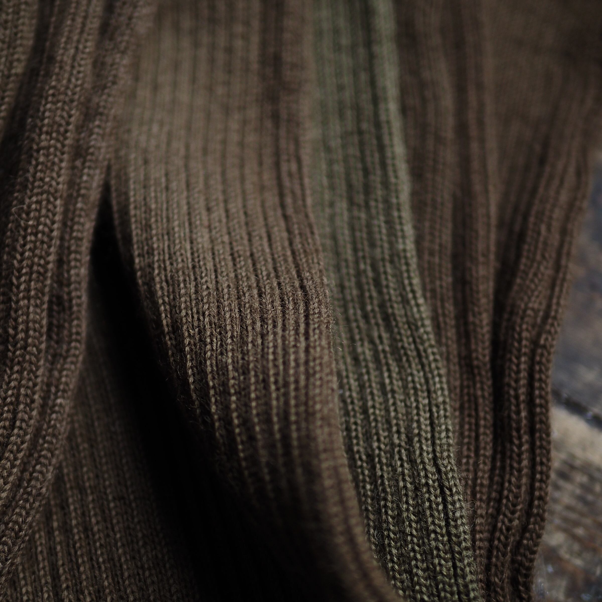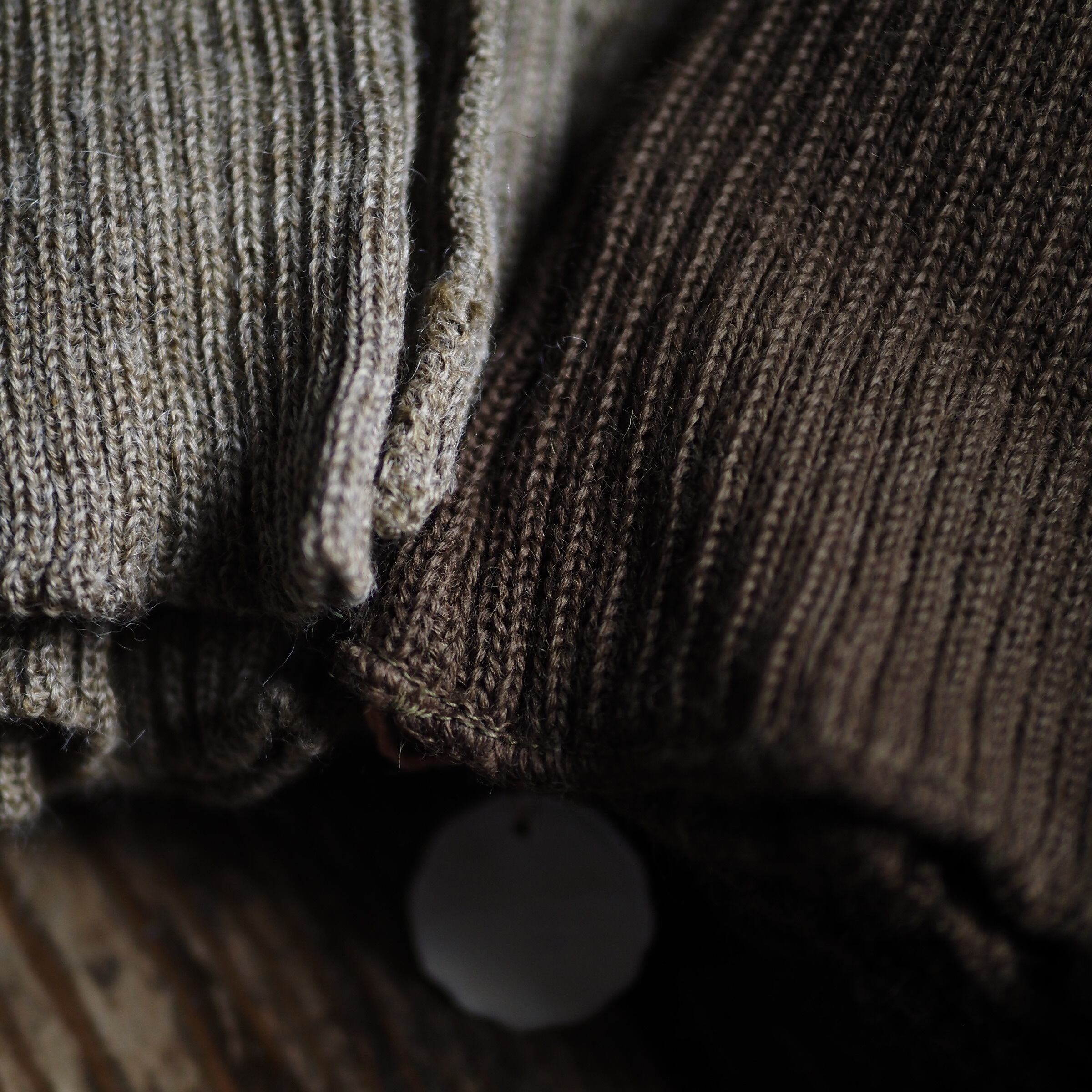 生地も古いニット独特のガサっとした手触りとコシと弾力のあるリブ編みの雰囲気が抜群にマッチ。